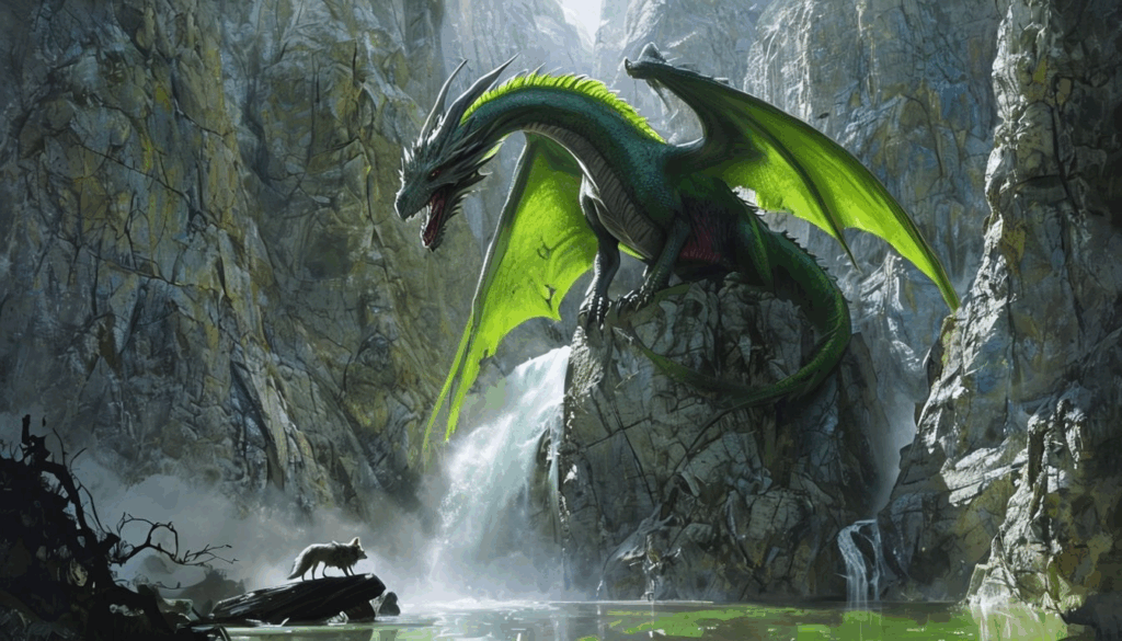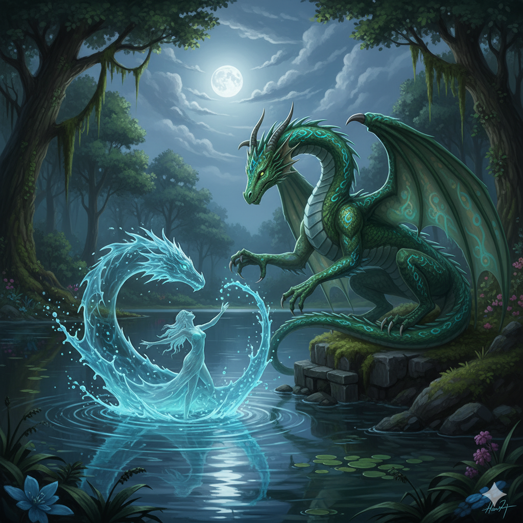 Μια μέρα, καθώς σχημάτιζε με τα χέρια της κύματα που έμοιαζαν με δράκους, το νερό αναδεύτηκε από μόνο του. Ένα γιγάντιο κύμα, με την μορφή αληθινού δράκου, υψώθηκε από την επιφάνεια της λίμνης και έπεσε επάνω της με βία. Εκείνη πίστεψε πως θα πνιγεί, μα προτού την αγγίξει το νερό, έγινε υδάτινη σφαίρα και την τύλιξε απαλά. Από τα βάθη της και μέσα από τους αφρούς αναδύθηκε ο Ντρούνκνα, ένας πανέμορφος γαλάζιος δράκος με μάτια σαν ατελείωτο ωκεανό.