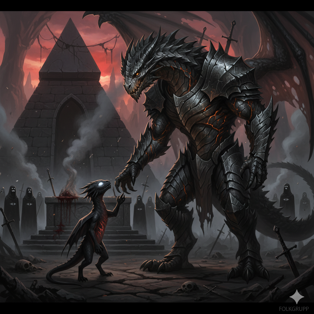 Οι εποχές περνούσαν, κι ενώ οι άλλοι Δρακοθεοί μάχονταν για δόξα και εδάφη, ο Φόλκγκρουπ αποτραβιόταν όλο και περισσότερο από αυτούς. Από ψηλά, παρακολουθούσε τους θνητούς. Τον γοήτευαν οι μάχες τους, η βία, το αίμα που πότιζε τη γη. Το μίσος τους τον μάγευε. Μέσα στον πόλεμο, οι άνθρωποι ήταν αληθινοί. Χωρίς μάσκες, χωρίς ψευδαισθήσεις.