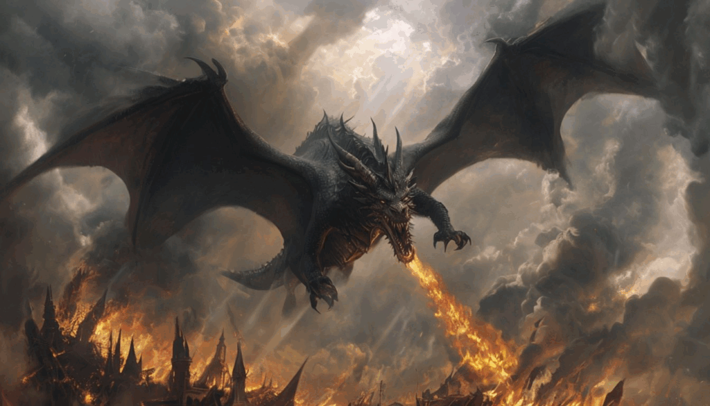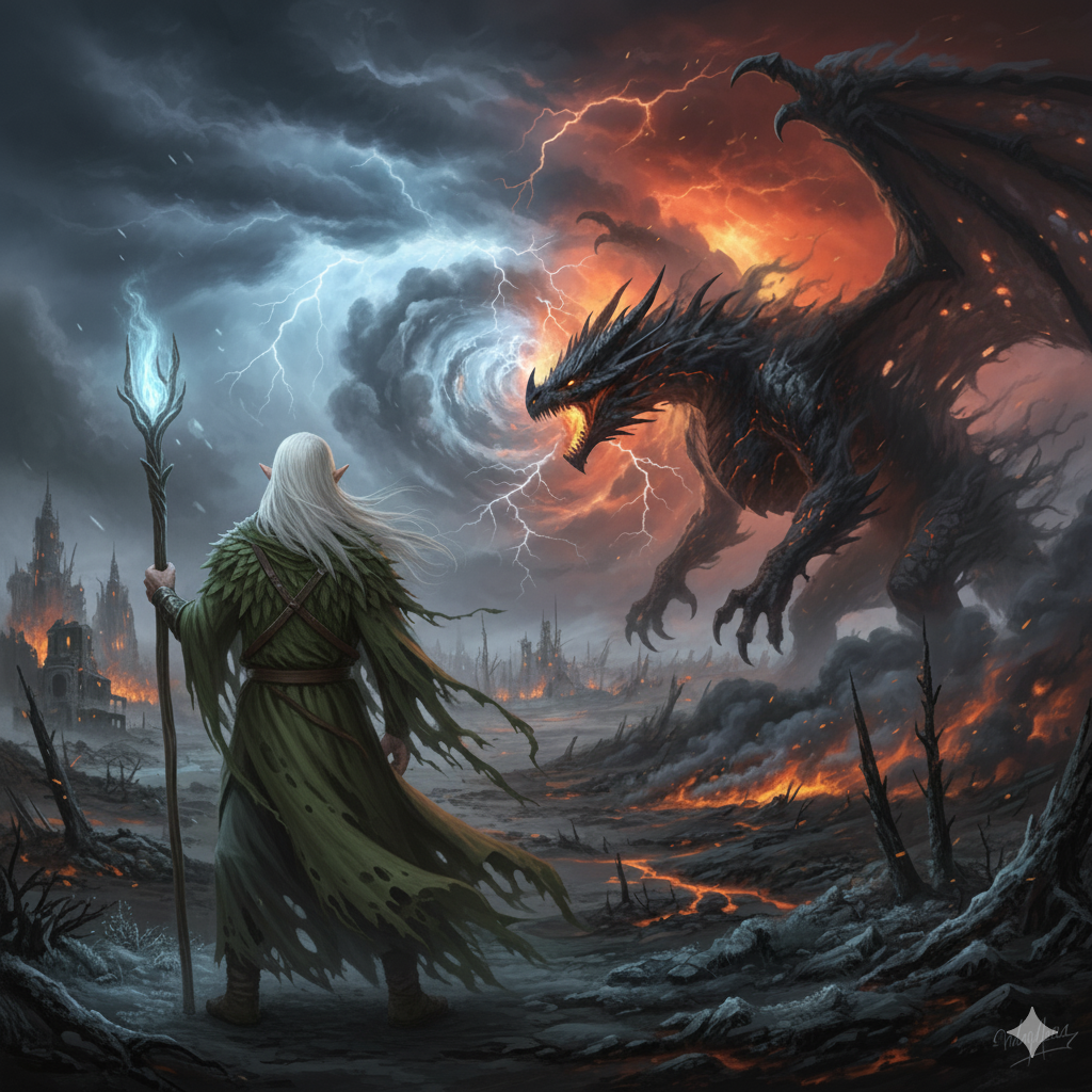 Στο τέλος, οι δύο πολεμιστές έπεσαν εξαντλημένοι, μέσα στο καμένο δάσος που δεν θύμιζε πια τίποτα ζωντανό. Ο Δράκος σήκωσε το φλογερό του κεφάλι και πρόφερε τη μοχθηρή υπόσχεση: