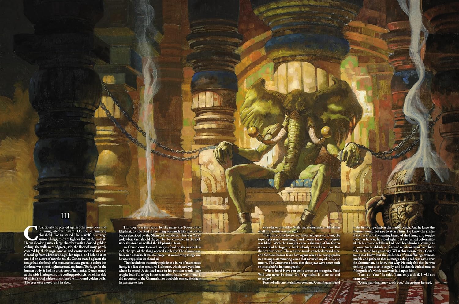 In the Maul district of Zamora, where bandits go to celebrate their crimes, a young barbarian, black hair, broad shoulders and powerful torso, hears a Kothian talking about the Tower of the Elephant. The thief tells him that it contains in its heights the Heart of the Elephant, a marvellous jewel that offers wealth and powers to the one who holds it. Without preparation, Conan the Cimmerian undertakes the ascent of this tower reputed to be impregnable, a journey that will test the body and mind of the barbarian…